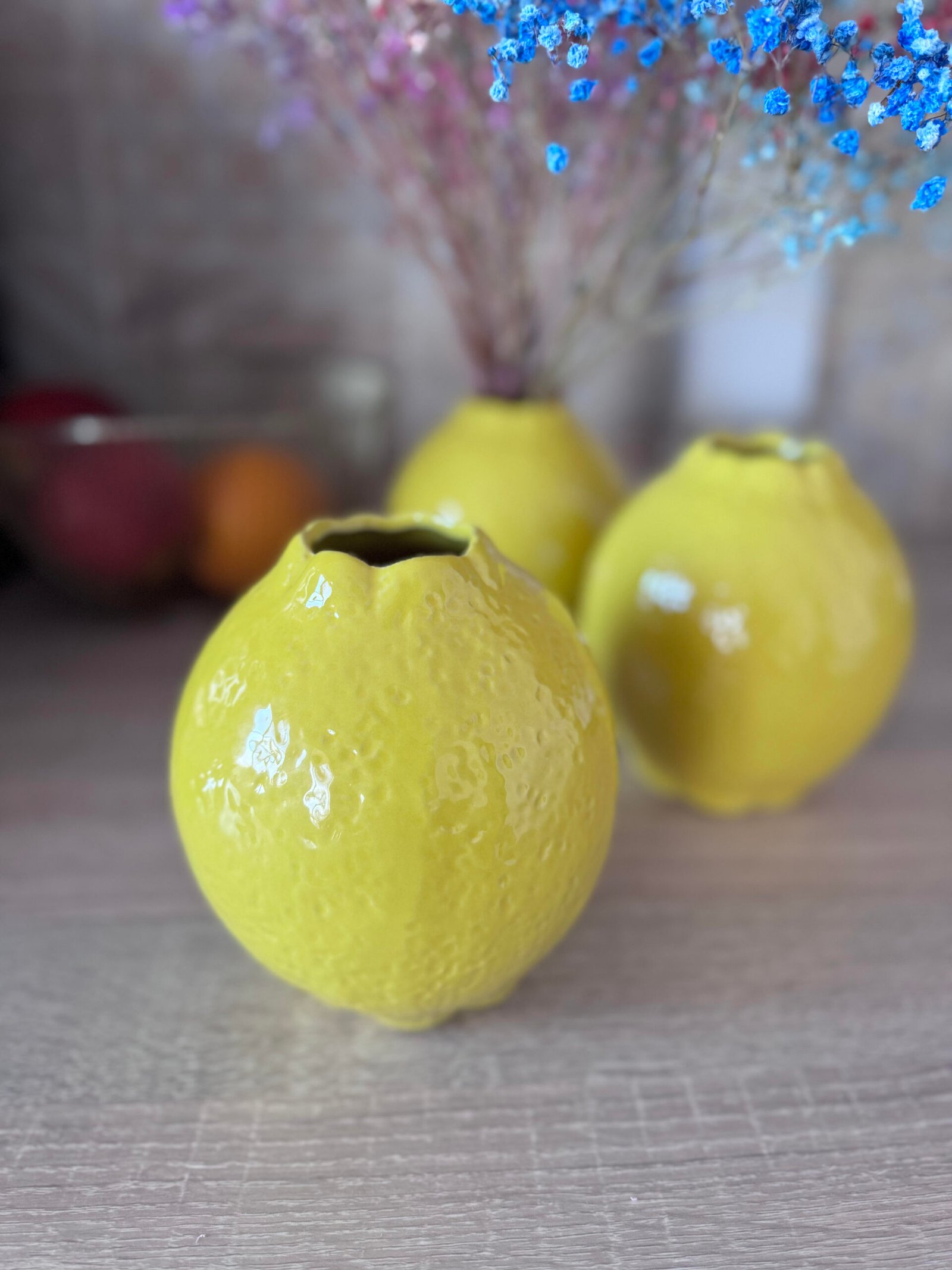 Akmens masės keramikinė vaza tarsi ką tik nuo medžio nuskinta milžinė citrina.