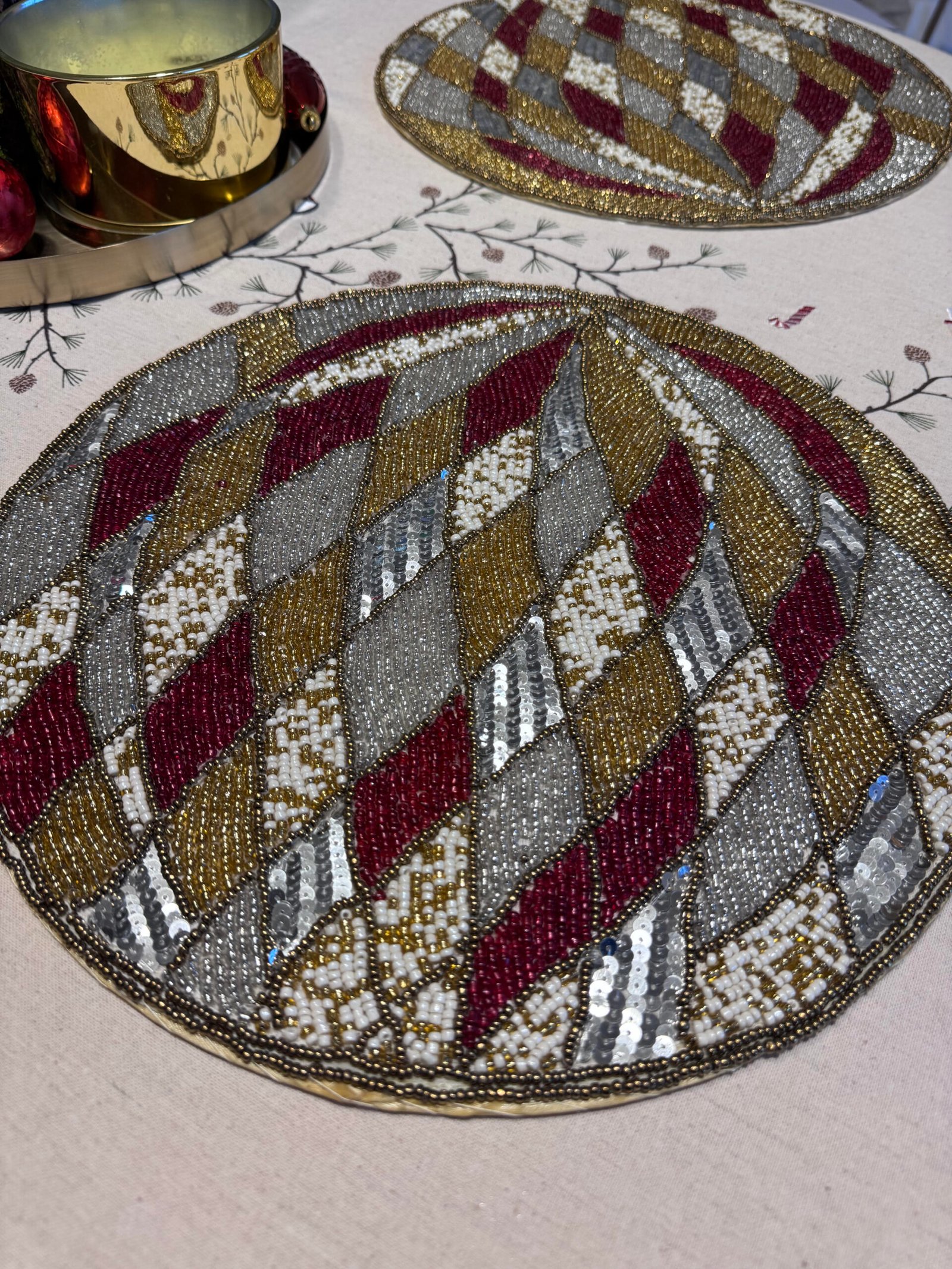 Apvalus stalo padėkliukas iš blizgių karoliukų.