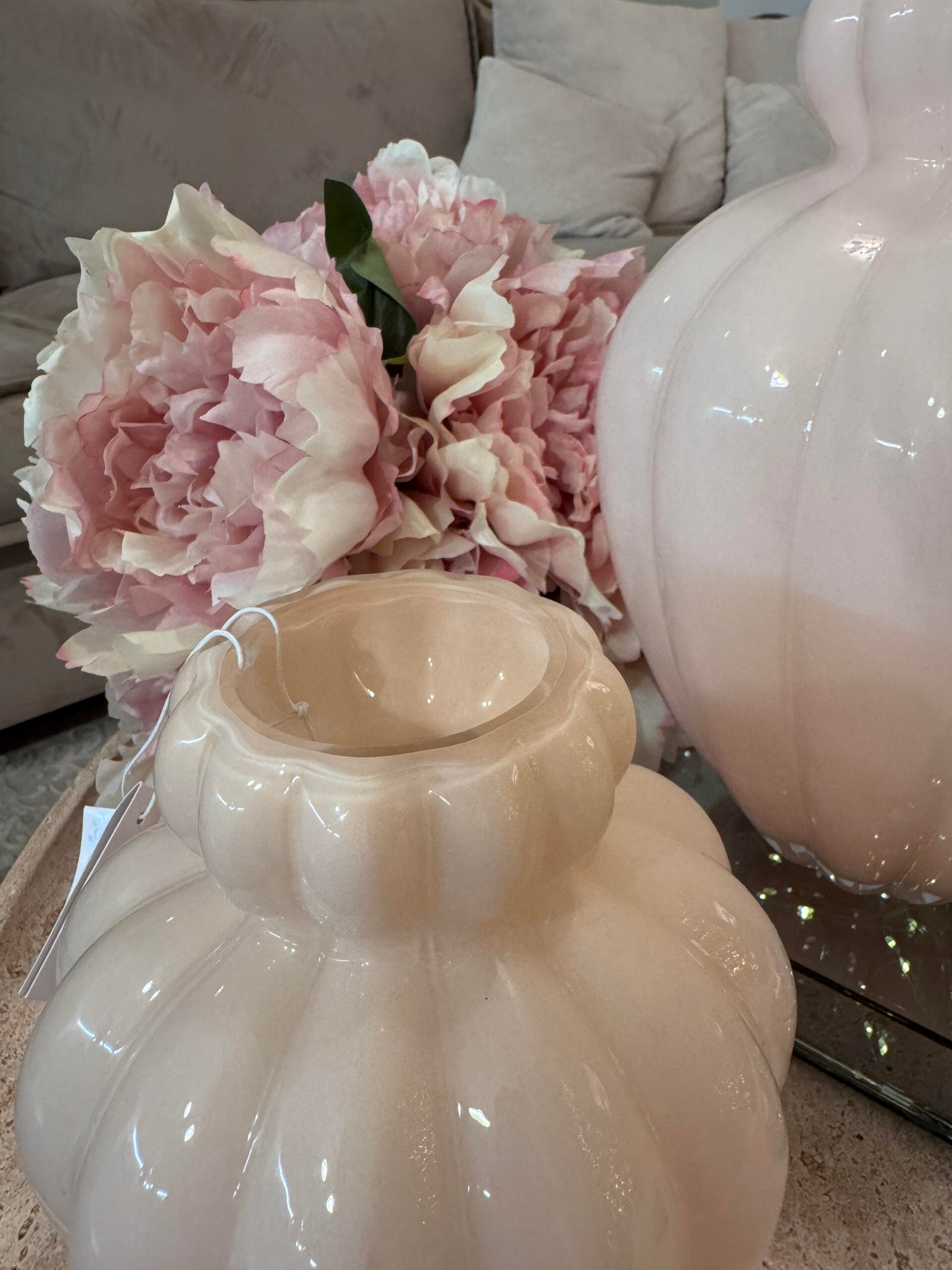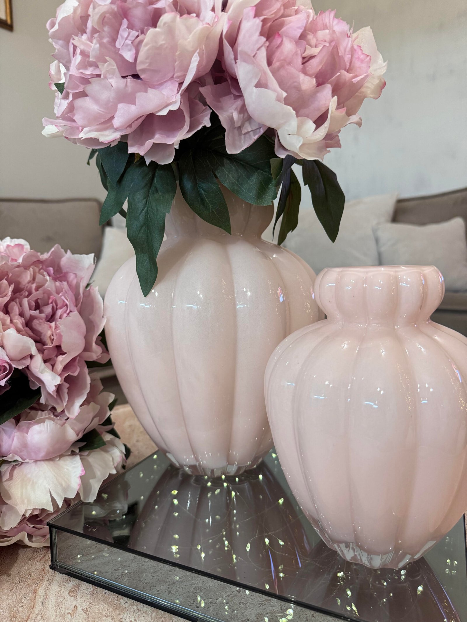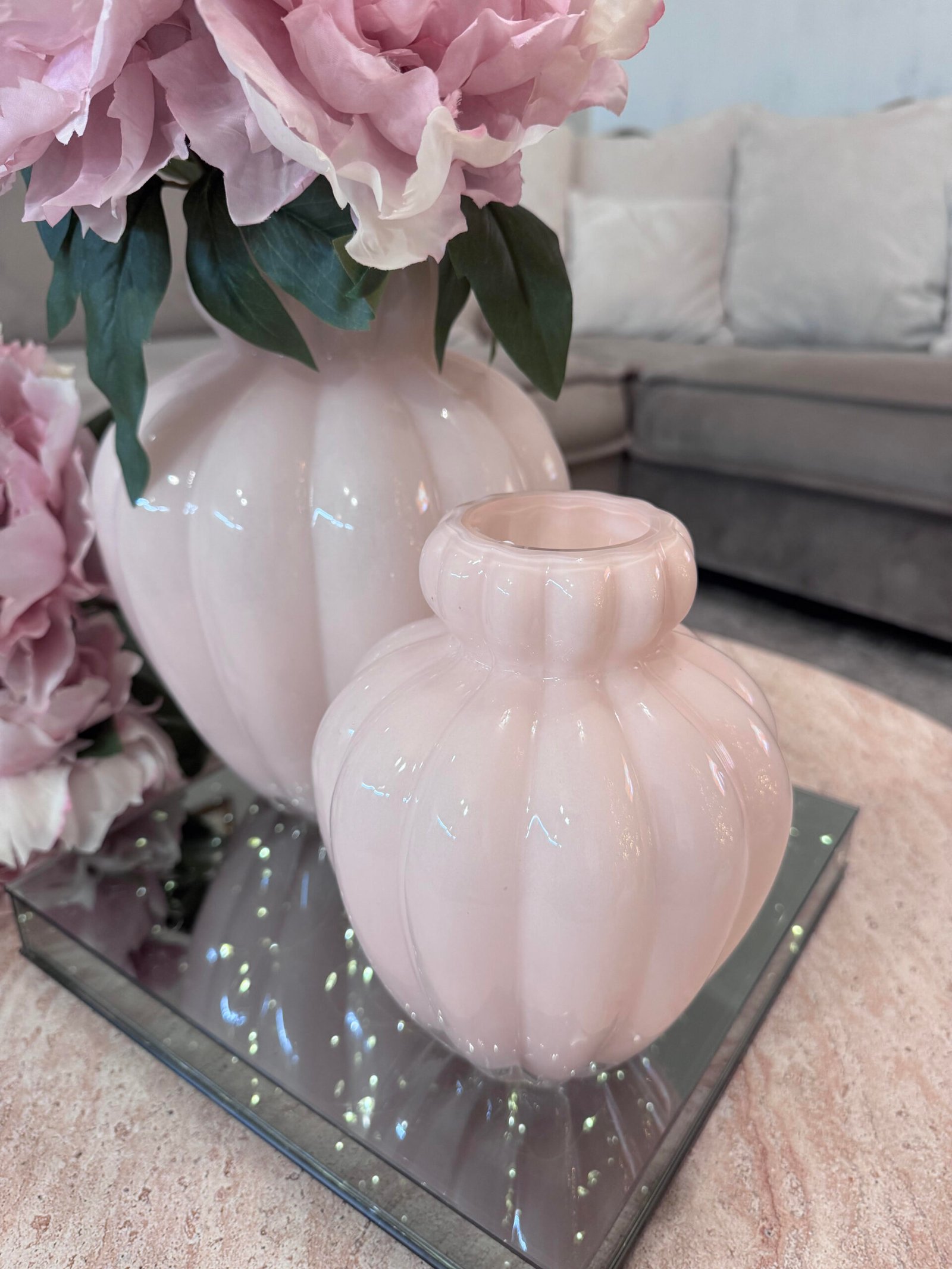 Opalinio efekto švelniai rožinės spalvos stiklo vaza.
